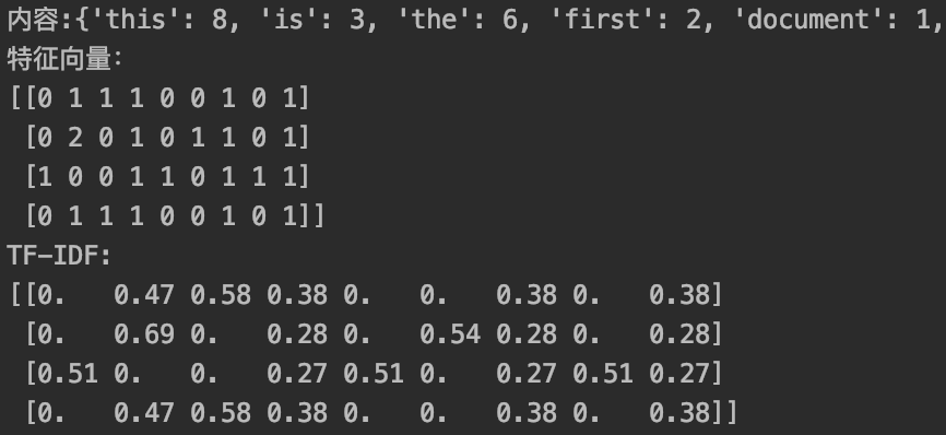 #TF-IDFfrom sklearn.feature_extraction.text import TfidfTransformerimport numpy as nptfidf = TfidfTransformer()#打印数组中全部元素#precision参数表示保留几位小数np.set_printoptions(precision=2)tfidf_t = tfidf.fit_transform(bag)print('TF-IDF:')print(tfidf_t.toarray())