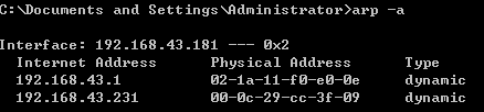 欺骗之前先查看一下XP中的ARP缓存表,在cmd中用arp -a命令:可以看出分别为网关的mac地址和局域网中另一个主机Ubuntu的MAC地址