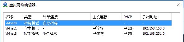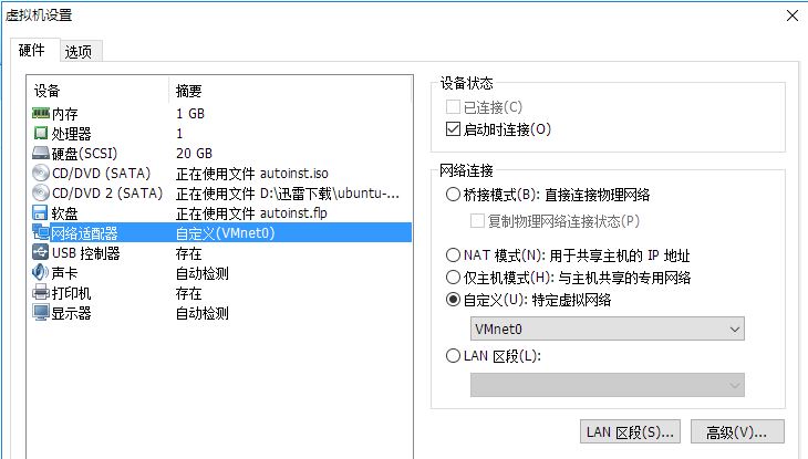 将虚拟机的网络连接模式设置为桥接模式,在试验过程中发现仅在虚拟机设置中将网络适配器设置为桥接模式不能使两个运行的虚拟机处于同一个局域网中。需要将网络适配器设置为自定义,选择特定虚拟网络中的桥接网络。具体有哪些虚拟网络可以在 编辑->虚拟机网络编辑器 中添加、配置、删除。