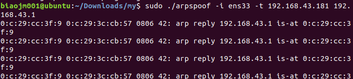 其中的interface可以在Ubuntu中查看网关是看到,本机为ens33,这条命令的意思即为:欺骗主机host自己就是主机target