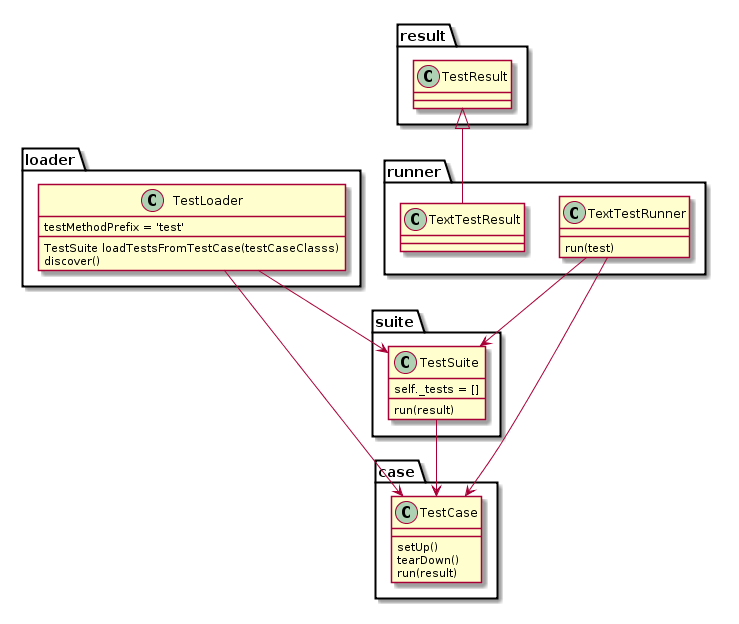 - TestRunner是来执行测试用例的,测试的结果会保存到TestResult实例中,包括运行了多少测试用例,成功了多少,失败了多少等信息