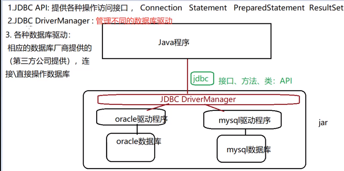 2、JDBC API主要负责三个功能:(1)与数据库建立连接(2)发送SQL语句给数据库(3)数据库将结果返回