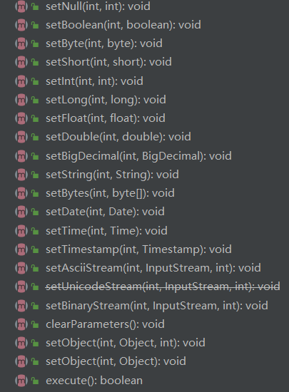查看PreparedStatement的源码 ,可知PreparedStatement继承Statement,Statement里有的方法PreparedStatement都有,但是PreparedStatement还有很多SetXXX方法