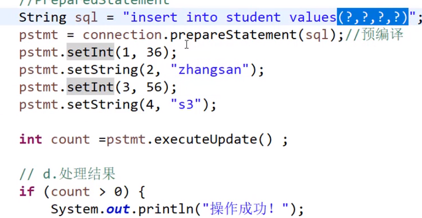 (1)编码更加简洁灵活:在PreparedStatement中SQL语句后的查询条件,插入的值可以用占位符(?)来表示,不用像Statement一样写具体的值,只需要调用PreparedStatement中的SetXXX方法赋值即可。