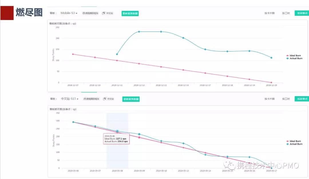 我们使用的是携程自研的iKanban,这是我们燃尽图,下图分别是第3次迭代和第13次迭代时的燃尽图,越来越趋向于理想化,我们2周一次迭代,这是我们9个月来不断总结-改进的成果。
