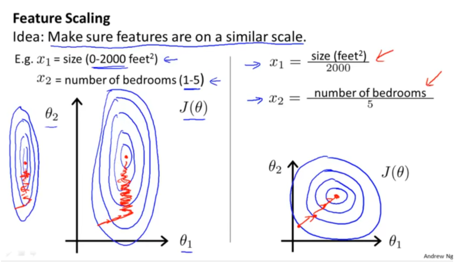 原始特征下,因尺度差异,其损失函数的等高线图可能是椭圆形,梯度方向垂直于等高线,下降会走zigzag路线,而不是指向local minimum。通过对特征进行zero-mean and unit-variance变换后,其损失函数的等高线图更接近圆形,梯度下降的方向震荡更小,收敛更快,如下图所示,图片来自Andrew Ng。