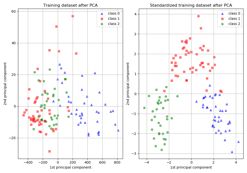 从几何上观察上述方法的作用,图片来自CS231n-Neural Networks Part 2: Setting up the Data and the Loss,zero-mean将数据集平移到原点,unit-variance使每维特征上的跨度相当,图中可以明显看出两维特征间存在线性相关性,Standardization操作并没有消除这种相关性。
