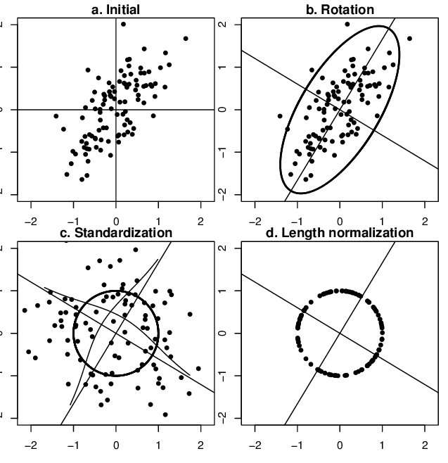 可通过PCA方法移除线性相关性(decorrelation),即引入旋转,找到新的坐标轴方向,在新坐标轴方向上用“标准差”进行缩放,如下图所示,图片来自链接,图中同时描述了unit length的作用——将所有样本映射到单位球上。