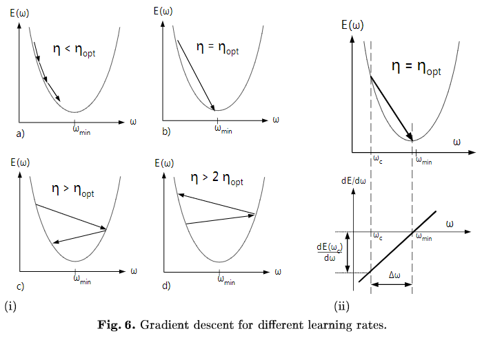 E(W)为损失函数,收敛速度取决于:参数的初始位置到local minima的距离,以及学习率η的大小。一维情况下,在local minima附近,不同学习率对梯度下降的影响如下图所示: