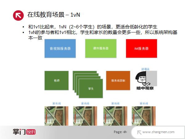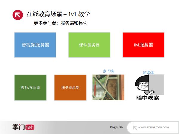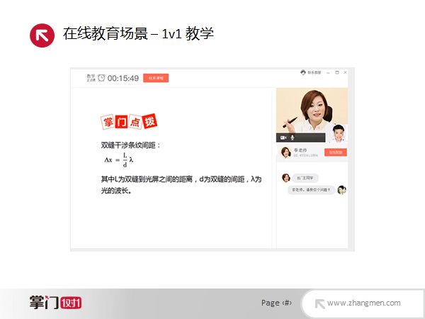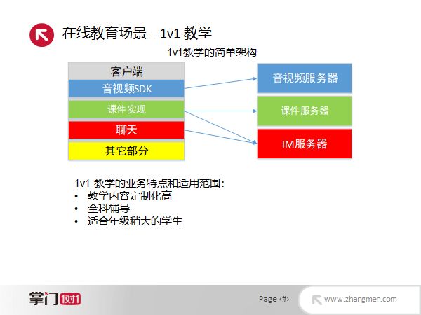 首先为大家介绍的在线教育场景是“1对1”教学,上图是掌门1对1官网的一幅宣传图,它讲的是一个1对1教学的场景,就是一个老师和一个学生在一起上课的情景。我们将图中的场景进行了分析简化。