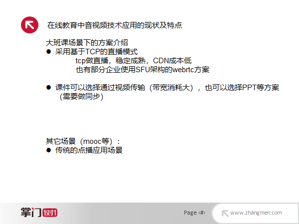 接下来,介绍一下大班课场景下的特点,大班课非常类似于网红直播,技术架构也非常像,直接采用稳定的TCP模式做直播,然后就是用CDN,成本比用UDP传输的WebRTC自建要低很多。另外,也有一些企业采用的是SFU架构的WebRTC方案,其目的可能是出于资源的复用。除此之外,大班课的课件可以选择通过视频传输,这时候带宽消耗会大一些,但是它的客户端兼容性会好一些。