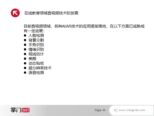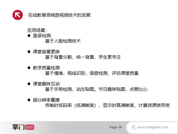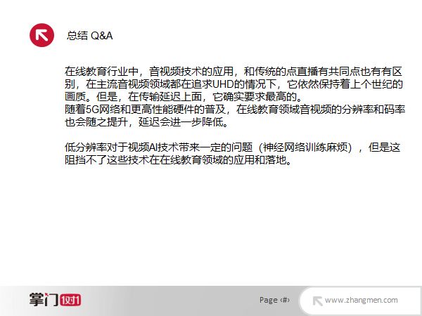 总结一下,当前在线教育领域的音视频技术的应用和传统的点播、直播技术有共同点也有区别,主流的音视频领域都在追求超高分辨率和较高的帧率,但是在线教育行业只是在传输延迟方面的要求是最苛刻的。随着5G网络和一些高性能硬件的普及,在线教育领域音视频的分辨率、码率也会随之提升,延迟也会进一步降低,但上升的速度肯定是比不上传统音视频领域的。另外,低分辨率还会带来一些麻烦,举例说明,在视频AI技术里面一般都会用神经网络去训练一些模型。在训练模型时,大部分算法工程师的处理都是基于分辨率比较高的部分做的,这种比较低的分辨率在训练的时候会比较麻烦。而且除了在线教育之外,其它一些比较常见的场景,基本上分辨率会越来越高。因此,能够在在线教育的低分辨率上面应用视频AI技术也是一个挑战,但是在线教育依然是一个非常火爆的领域,并且是在不断向前发展的。