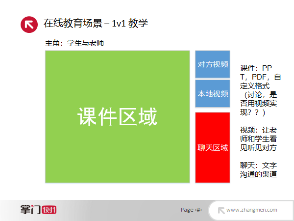 从简化过的图中可以看出,1对1教学时,上课的主角就是学生和老师,在课件区域的右上方会显示自己的视频和对方的视频,而学生和老师关注的重点部分是课件区域。另外同样包包含一个聊天区域,方便大家进行一些文字的交流;课件区域一般会选择上传PPT或PDF格式的课件,但同样存在一些自定义格式的复杂课件。同样,在这个区域也能播放一些视频或者小游戏;视频区域,主要是为了使得学生和老师之间的互动与交流更好一些。而聊天区域,就是文字沟通的渠道,当声音断了或需要需要说一些比较长的字符时,用文字区域表达会更好一些。