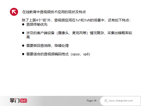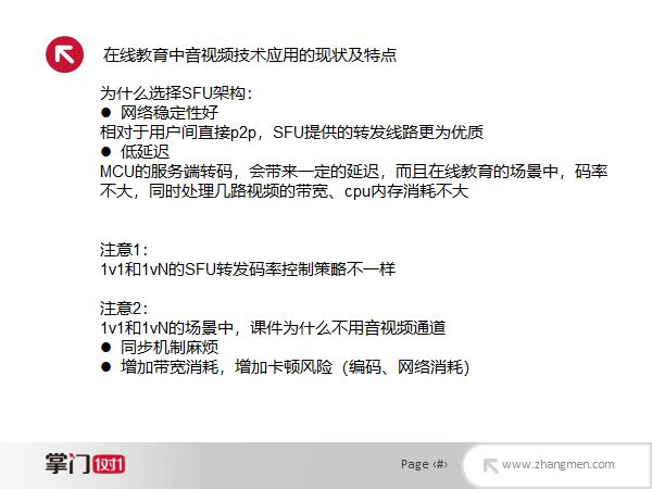 除了刚才说的四个低之外,在1对1、1对N的场景中,还有如下特点:首先,音频传输优先,一般来说,在上课时,老师的画面卡几帧或者卡几秒都不是问题,但是声音不能断。其次,因为现在是移动互联网的时代,用作客户端的设备种类繁多,它们所带的摄像头、麦克风等硬件质量参差不齐,对这些设备进行媒体采集后,视频做起来就非常的麻烦。需要对音频进行回音消除及降噪处理。最后,我们常用的一些音视频编码格式在当前场景中不一定是适合的,比如说,现在WebRTC里面音频格式是Opus,视频格式是VP8,当然也支持H.264,但是最好是没有双向预测帧的,否则会导致延迟进一步增大。总结一下,以上这些就是在线教育中音视频的基本特点,而其中最重要的关键点就是低延时。
