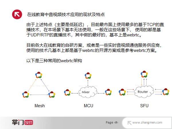 为了实现低延迟,目前市面上使用最多的直播技术有RMTP、HLS、Dash等,但在这种1对1、1对N的教学下,基本上是无法使用的,随随便便延迟就会达到3~5秒。目前基本上采用的都是基于UDP/RTP的直播技术,而做得相对比较成熟的就是WebRTC了。现在各大在线教育以及一些音视频通道服务供应商的自研方案,基本上都是基于WebRTC开源方案或者参考了WebRTC的方案提出来的。我们常见的WebRTC连接方案有三种,第一种是Mesh,就是所有的客户端都是P2P的;第二个种是MCU,大家都把流发到一个中间的MCU上,进行混流之后,分发到每个客户端。其好处就是每个人的带宽低,缺陷是延迟会稍高一些;第三种是SFU,也是最常用的,就是每个人都把自己的流都推上去,服务端只做转发,人越多的时候,流的数目就越多。