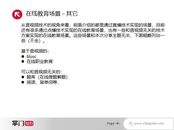 最后,我们讲一下在线教育中的一些其他场景,刚才介绍的都是一些需要用到音视频技术或者是通过直播技术实现的在线教育的场景。除此之外,还有一些基于点播的教育场景,如MOOC、网易云课堂等;还有和音视频无关的,如在线搜题解题、阅读、背单词等。