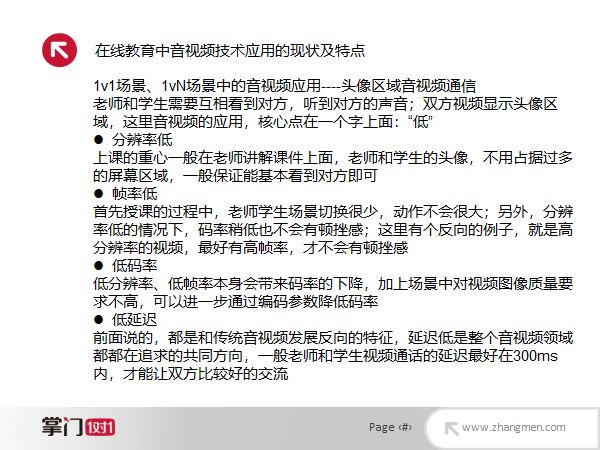 首先在1对1和1对N的场景中,老师和学生需要相互看到对方,因此音视频技术一般应用在头像区域的视频通信中。这里涉及到的音视频的特点,核心在于一个字就是“低”。第一,分辨率低。正如你们现在在直播间看我分享一样,我的头像分辨率就是非常低的,大家关注的重点在于PPT的内容而并非分享者本人。简单的说,在1对1教学的时候,只要能保证能看到老师和学生大概长什么样子就可以了,不要求高分辨率。第二,帧率低。帧率低与场景有关,因为老师在讲课时不会有那种剧烈的动作,所以帧率低一些也可以。另外,我们知道一个事实,当分辨率越高的时候,需要更高的帧率才能让视频没有卡顿感,而在线教育基本上是240P的分辨率,帧率为15帧每秒就足够了。第三,码率低,在分辨率和帧率都低的情况下,我们编码出来的视频码率就很低,加上场景中对视频质量的要求也并不是特别高,在编码时,通过设定一些质量参数,可以进一步地把码率压缩得更低。第四,延迟低,学生跟老师之间的沟通延迟最好在300毫秒以内,大家交流才比较好。当大家用微信语音或微信视频去跟朋友聊天时,如果说你们两个中有一个人的网不好,就会延时很高,变得卡顿起来,导致体验很糟糕,所以这里也是同样的,我们希望延迟能够尽量的低,老师说完一句话,学生马上就能够得到反馈。