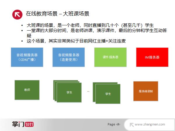 另外,第三个场景就是一个大班课的场景。大班课场景就是有点类似于我们在教室里面上课,是一个老师在讲台上讲,几十个或者更多学生在下面听课,这种场景类似于网红直播的方式。大班课场景的讲师会一直讲课,直到课程末尾的时候才会进行答疑环节,学生则通过连麦来提问。在服务端有一个音视频服务器,更加偏向于CDN广播,另外还有一个音视频连麦服务器,这个连麦服务器跟WebRTC的这套技术就比较类似了,同样它也有课件服务器和IM服务器。在客户端,与1对N的客户端架构类似,但因为不用考量学生跟老师之间的互动情况,因此监课的需求也就没那么高了。
