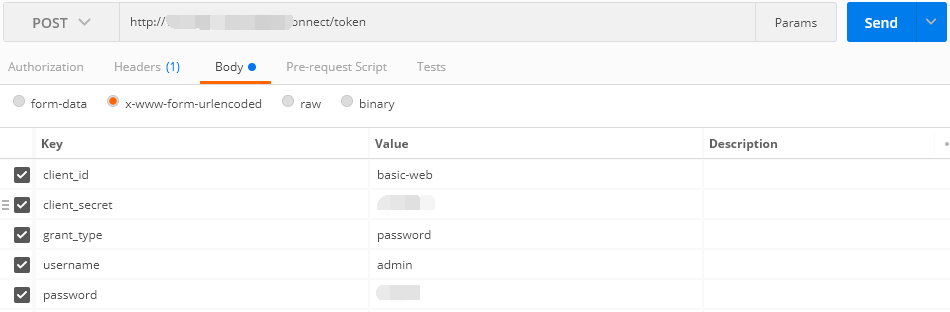 注意:ids4中token接口参数必须是x-www-form-urlencoded,使用postman模拟如下: