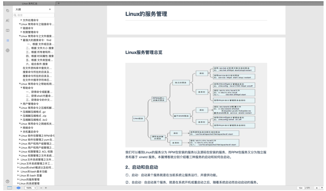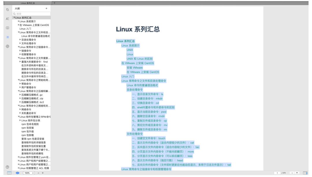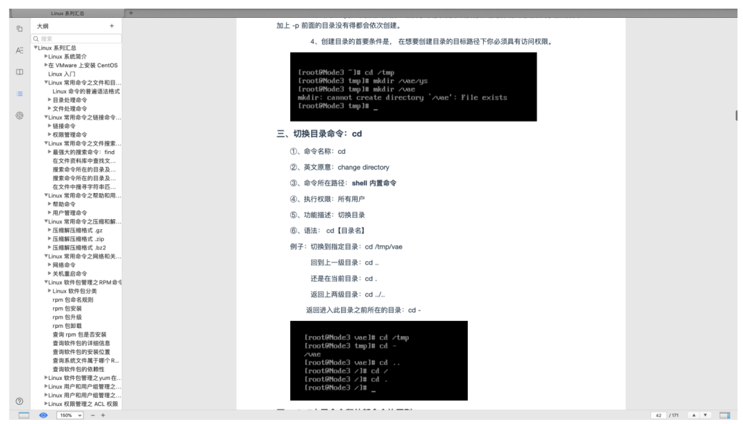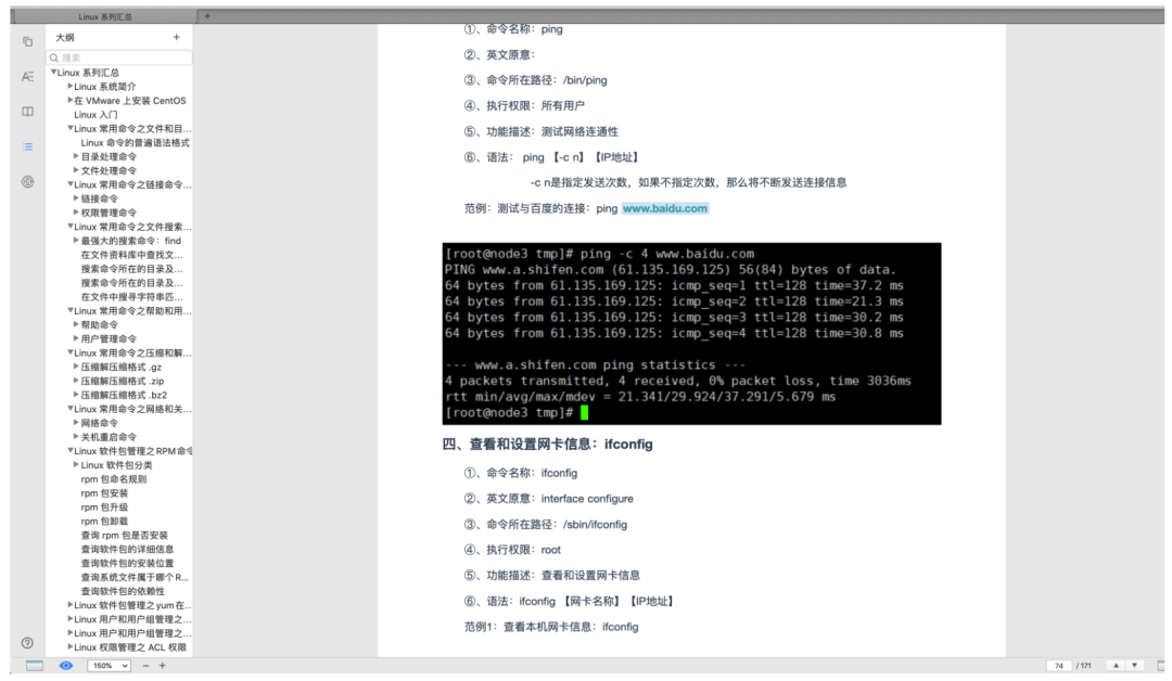 一共是 171 页,设计 Linux 各种命令汇总,可以说是非常全了,命令都是一个一个敲的
