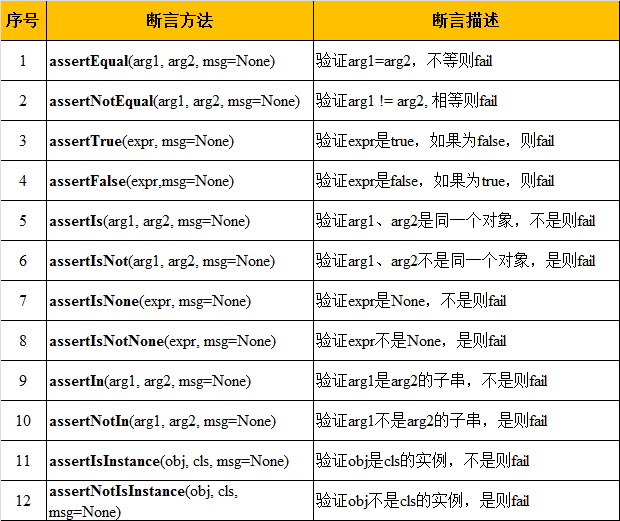 self.assertEqual(),是TestCase类中的断言函数,用来做判断的,用以判断该条测试用例是否通过。通过名字我们可以看出,这个函数的意思是判断两个值是否相等,如果相等,则用例通过,如果不等,则用例不通过。类似的,断言函数还有很多:有一个msg参数,如果指定msg参数的值,则将该信息作为失败的错误信息返回