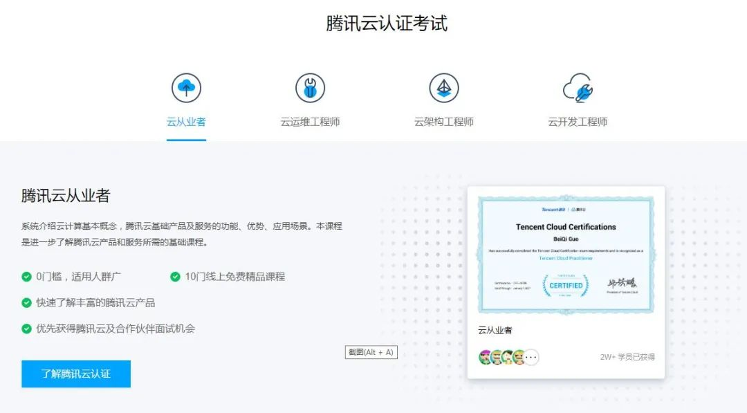 一方面能够为高校学生、IT 从业者提供全面系统的培训课程和认证考试服务,助力他们获得腾讯云权威专业凭证,提升就业及职场竞争力。另一方面,也为企业筛选、培养人才提供规范化标准,帮助企业用人单位快速甄选人才。