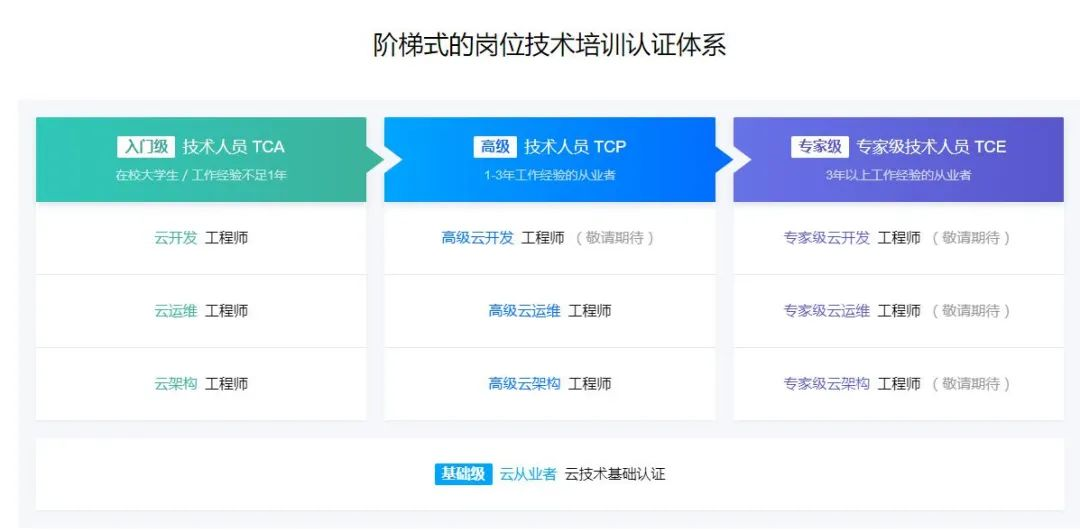 腾讯云认证是针对IT从业者者和在校大学生的专业权威技术认证体系,包括云计算技术认证、专项技术认证和高校认证三方面,提供多个职业发展方向的认证路径,相关领域人才能够清晰的了解晋级之路。
