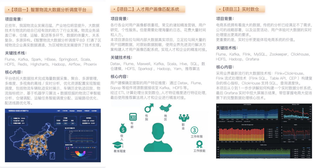 拉勾教育的课程项目都是拉勾自己的真实项目和合作大厂的项目,保证了「 PB 级数据」和「项目真实性」。