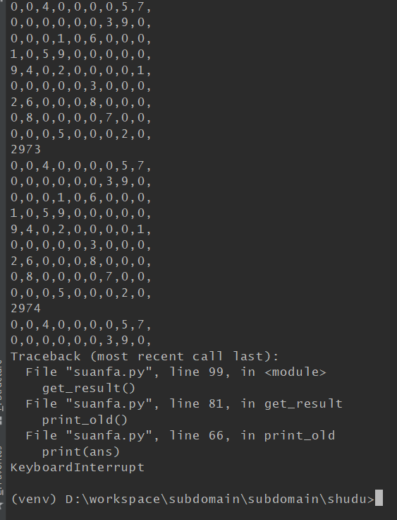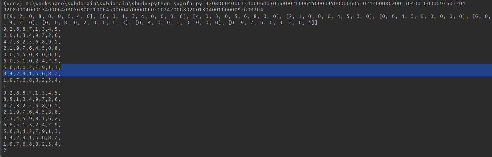 正如上面说到的一样,每一次填完之后,都需要判断当前是否还有空没有填,如果有,则继续进入遍历判断。如果没有空可以填,代表算法完成,打印出结果直接退出。