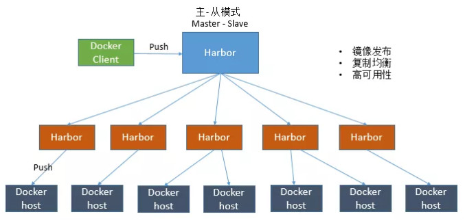 在实际生产运维的中,往往需要把镜像发布到几十或上百台集群节点上。这时,单个 Registry 已经无法满足大量节点的下载需求,因此要配置多个 Registry 实例做负载均衡。手工维护多个 Registry 实例上的镜像,将是十分繁琐的事情。Harbor 可以支持一主多从的镜像发布模式,可以解决大规模镜像发布的难题:
