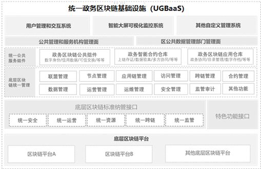 系统包括底层区块链、底层区块链标准纳管接口、底层区块链管理、统一公共服务组件等。