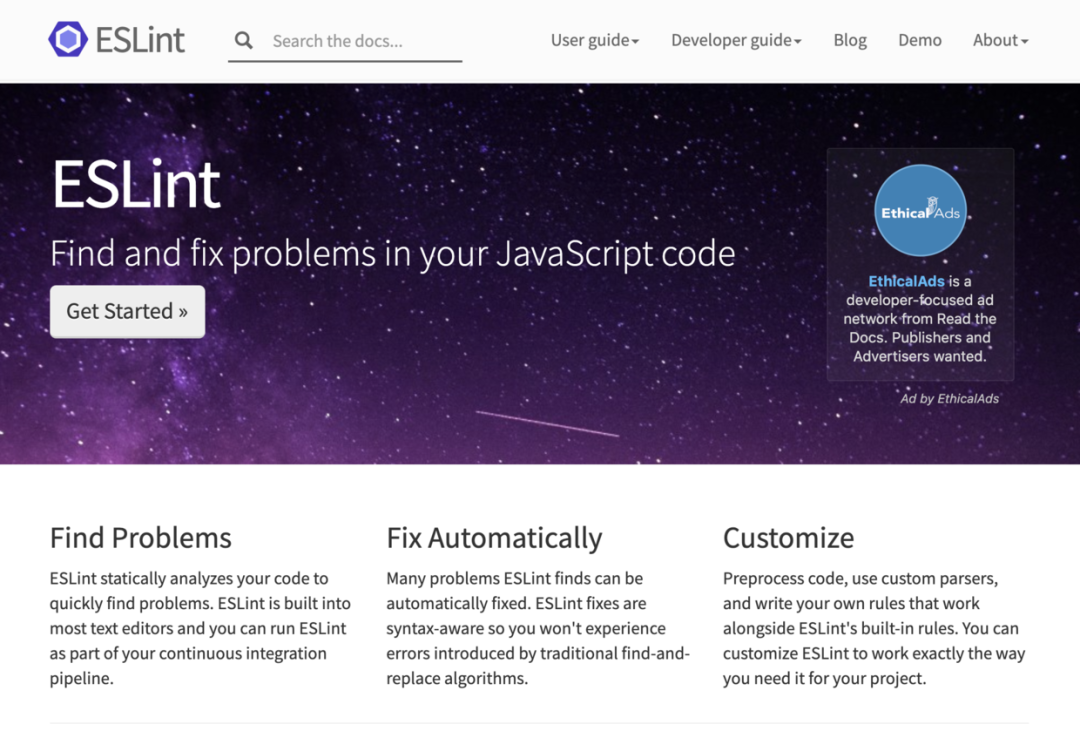 ESLint 静态分析您的代码以快速发现问题。ESLint 内置于大多数文本编辑器中,您可以将ESLint 作为持续集成管道的一部分运行。