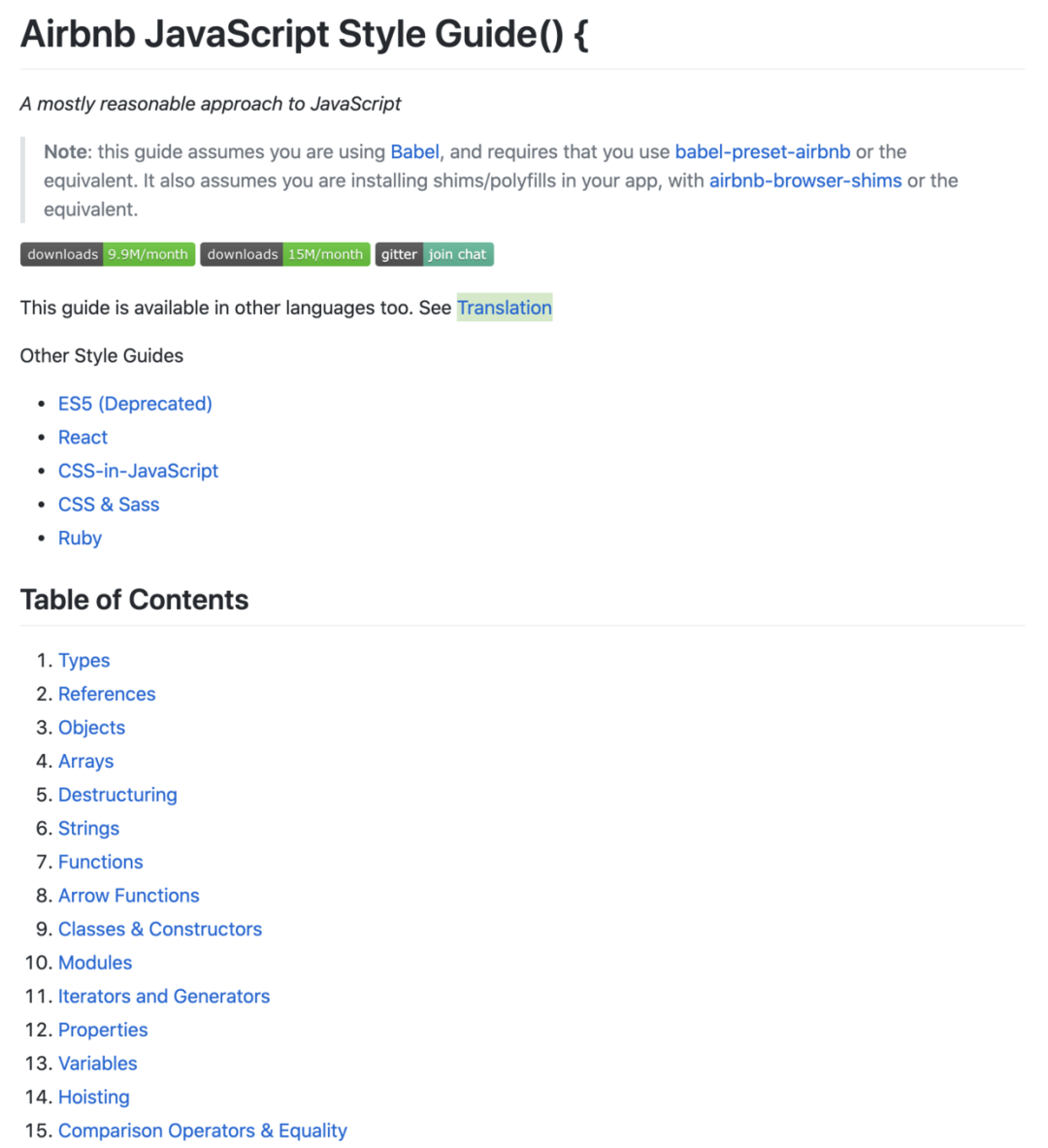 包含了:类型、对象、数组、字符串、函数、属性、变量、提升、比较运算符 & 等号、块、注释、空白、逗号、分号、类型转化、命名规则、存取器、构造函数、事件、模块、jQuery、ECMAScript 5 兼容性、测试、性能、资源、JavaScript 风格指南说明