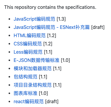 JavaScript编码规范、HTML、CSS、Less、E-JSON 数据传输标准、模块和加载器、包结构、项目目录结构、图表库标准、react 编码规范。
