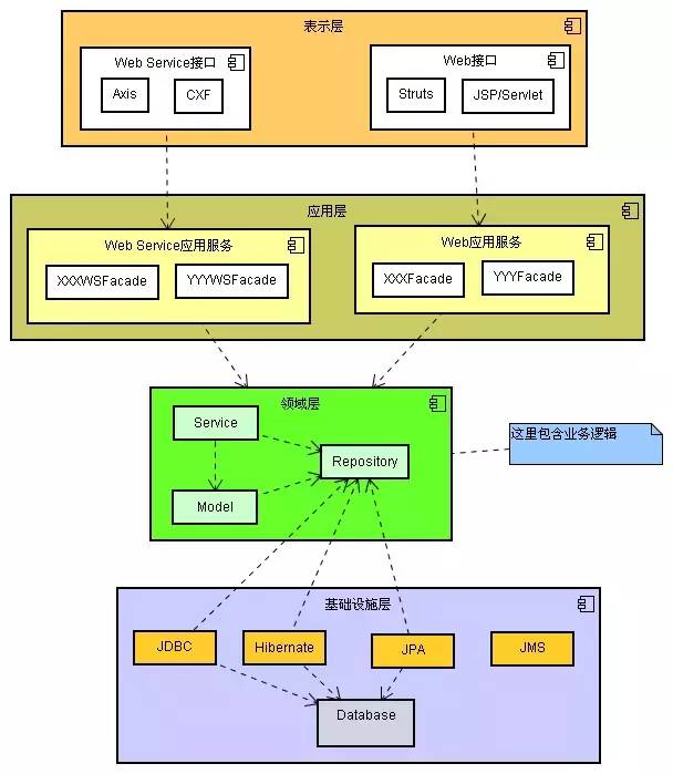 Domain为领域层(或模型层),负责表达业务概念,业务状态信息以及业务规则。尽管保存业务状态的技术细节是由基础设施层实现的,但是反映业务情况的状态是由本层控制并且使用的。领域层是业务软件的核心,领域模型位于这一层。