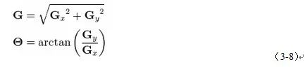 一幅图像中的边缘可能在方向上各有所异,所以Canny算法用四个滤波器分别检测图像中的水平、垂直和对角线边缘。边缘检测器(如 Roberts, Prewitt, Sobel)值返回一个水平方向分量Gx和竖直方向分量Gy,由此边缘梯度和方向即可确定: