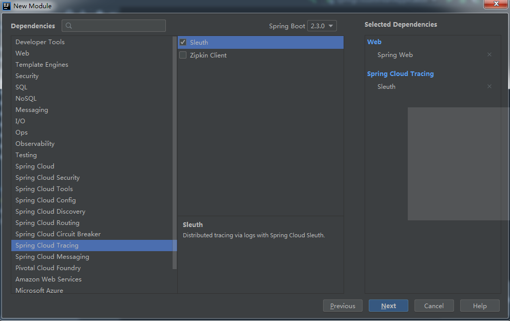 创建 Spring Boot 项目 sleuth ,添加 Web/Sleuth 依赖,如下:
