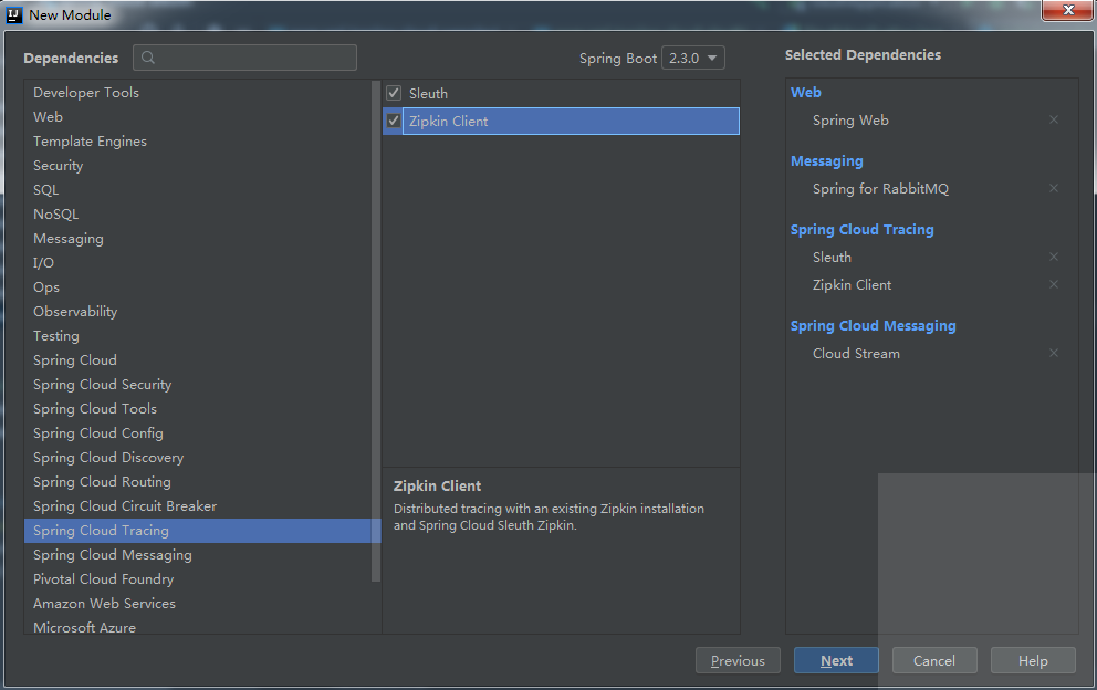 创建 Spring Boot 项目 sleuth-zipkin ,添加 Web/Sleuth/Zipkin Client/RabbitMQ/Cloud Stream 依赖,如下: