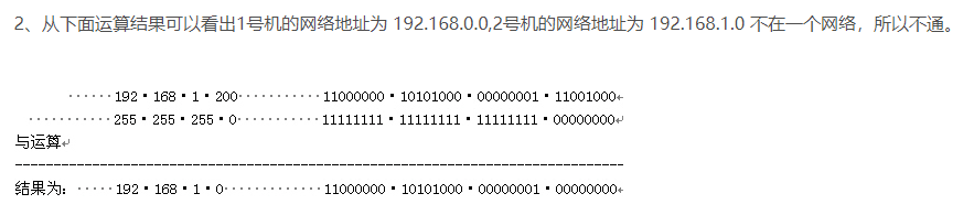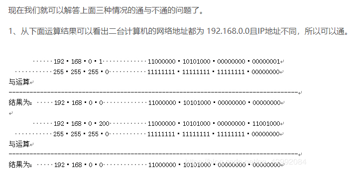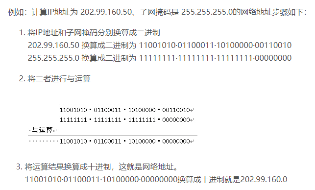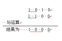 计算过程是这样的,将IP地址和子网掩码都换算成二进制,然后进行与运算,结果就是网络地址。与运算如下所示,上下对齐,1位1位的算,1与1=1,其余组合都为0