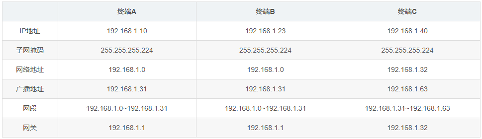网关:同一网段(子网)间终端可直接通信,如终端A和终端B;不在同一网段(子网)的终端不能直接通信,需要通过网关才能通信,如终端A和终端C。