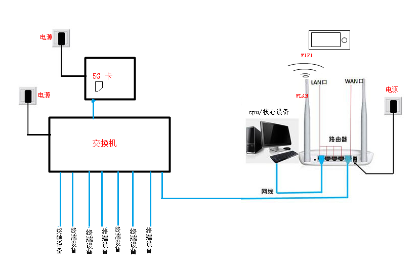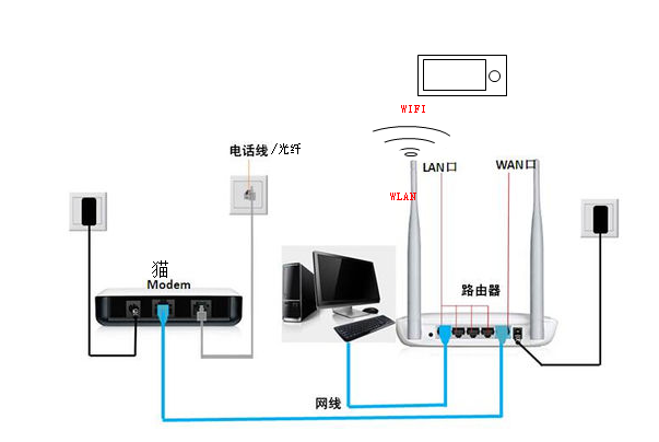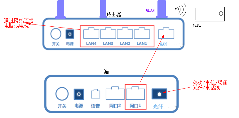 路由器lan口------->-电脑,路由器wlan天线--------->手机WiFi