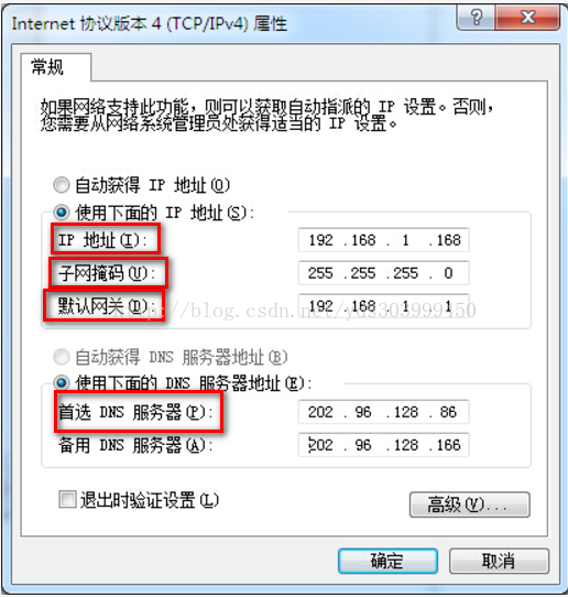 需要特别注意的是:默认网关必须是电脑自己所在的网段中的IP地址,而不能填写其他网段中的IP地址。