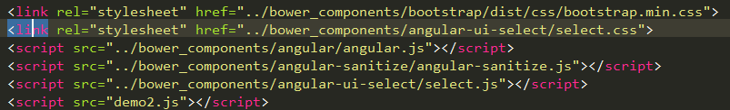 6 var app = angular.module('demo', ['ngSanitize', 'ui.select']);