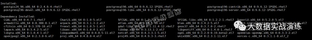 安装成功。接下来就是要将postgresql + postgis依赖的rpm包收集起来,然后做一个yum本地源,就可以进行离线安装了。