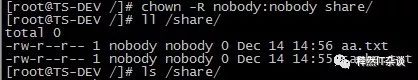 由于要设置匿名用户可以下载或上传共享文件,所以要给/share目录授权为nobody权限。