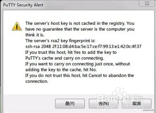 在图中所示Host Name的位置输入之前记录的公网IP,在Saved Sessions方框内输入会话名,并点击Save即可保存当前设置,以方便下次登录。 点击Open,进入命令行界面。在这之前,可能会有以下提示: