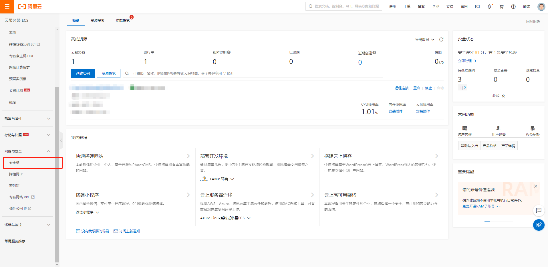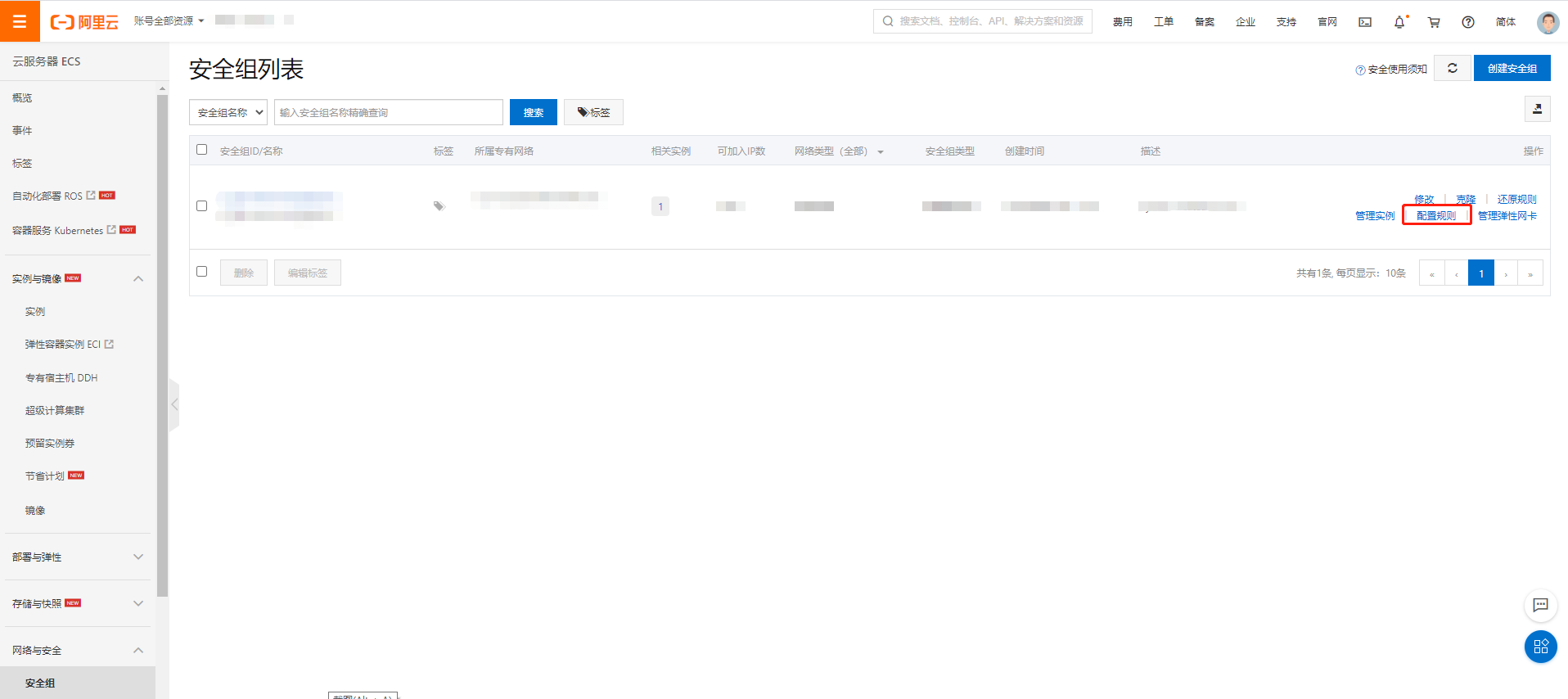 - 找到云服务器ECS -> 网络与安全 -> 安全组,点击进入