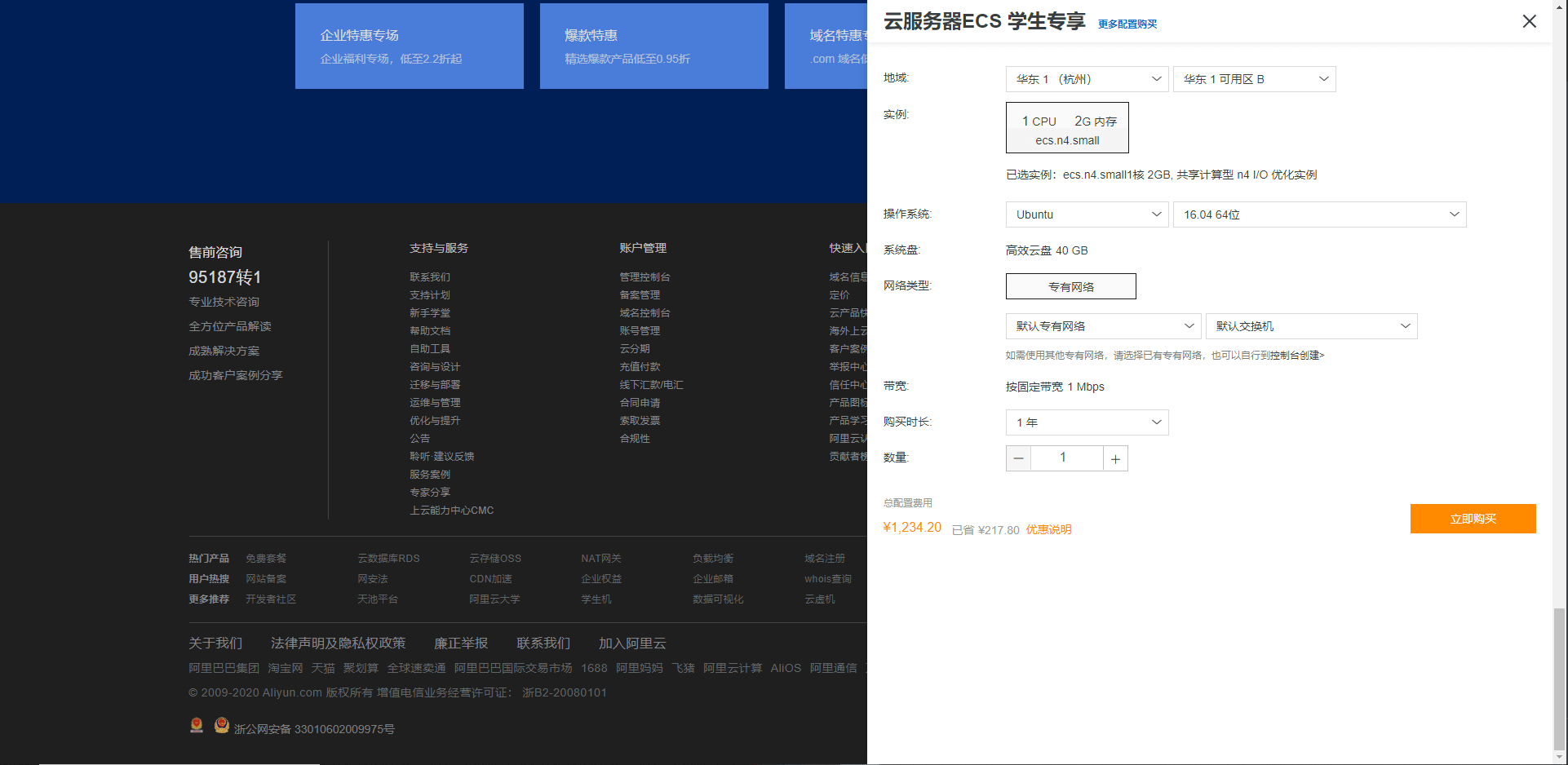 目前国内占有率比较高的就是腾讯云和阿里云,这里本人选择的是阿里云的ECS云服务器。(吐槽一下,普通价格真的比学生价贵太多了)
