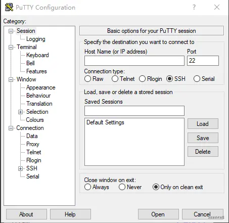 选择一款SSH工具登录远程服务器。常见的SSH工具有putty、xshell、xftp、SecureCRT等。这里我选择了putty,因为它简单易用,且不需要安装。 下载好putty之后打开putty.exe,登录界面如下: