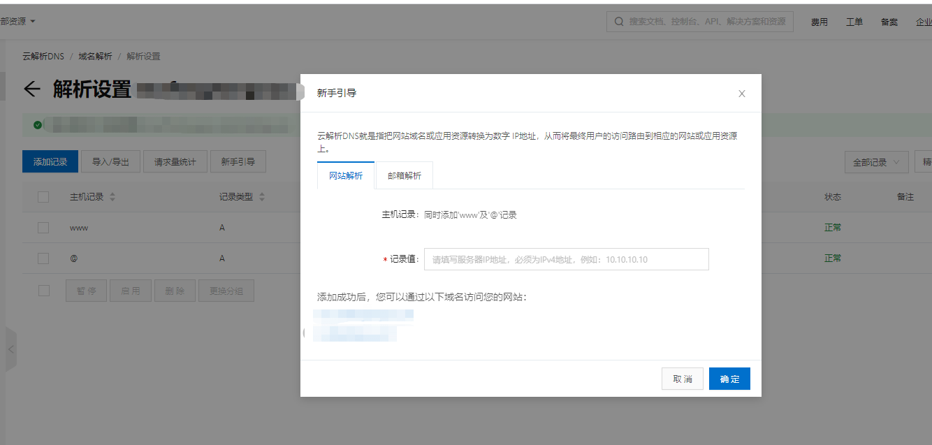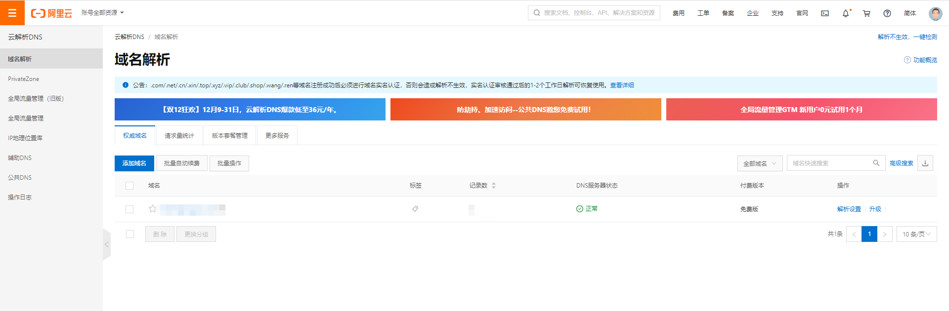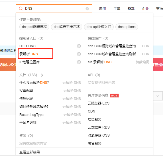 登录阿里云,打开云解析DNS -> 域名解析,这个模块不太好找,可以直接搜索。